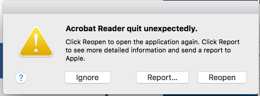 Now, each time I try to open a PDF, I am asked to sign in. When I do, it immediately receive the error message, "Acrobat Reader quit unexpectedly." I've changed passwords and there is no change. Apple tech support suggested I uninstall Adobe by double-clicking on the file "Adobe AIR Uninstaller." When I did so, nothing happened. Apple also suggested I speak with Adobe directly and connected me. When my call back finally came, I was told I could only get help by email, as I am not a paid subscriber. I do have the latest updates and Apple OS 10.13.4.