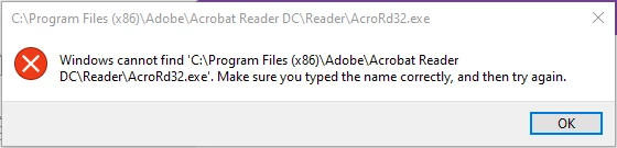 Acrobat reader will not open on my PC. I have run the cleaner tool and reinstalled, I have tried to install in compatibility mode for both windows 7 & 8 (even though I have Windows 10), I have created a new user profile on my PC and I have tried to disable my antivirus software, it still doesn't work. I keep getting an error "Windows cannot find 'C:\Program Files (x86)\Adobe\Acrobat Reader DC\Reader\AcroRd32.exe) but when I open the folder, the application (.exe) file is there. I can not open any pdf's or open Acrobat Reader at all. Have been trying several different things for a number of days now but havent found a solution. Please help!