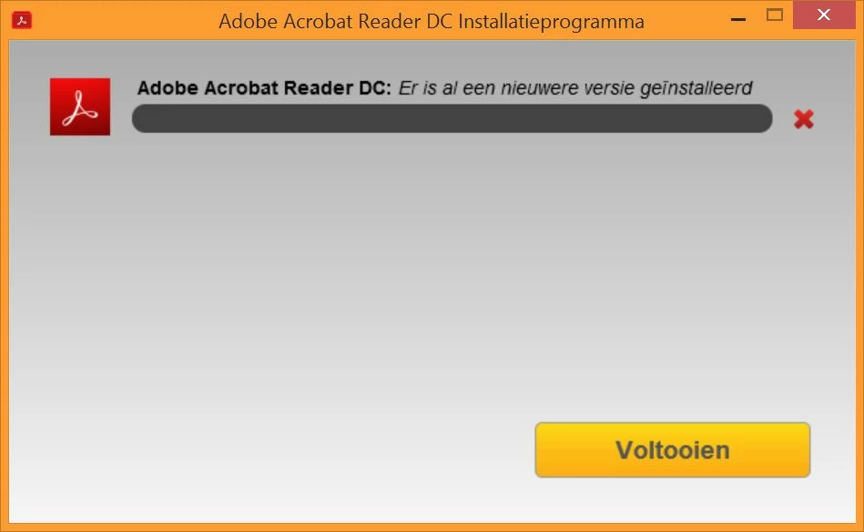 Als de installatie op 90% is krijg ik een icoon op mijn desktop die even later weer verdwijnt. Dan krijg ik de melding dat er al een nieuwere versie is geinstalleerd en de boel wordt afgebroken. Ik heb dit probleem gegoogeld en alle mogelijke oplossingen geprobeerd waaronder het Adobe cleaner programma laten lopen.