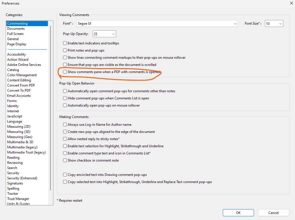 This problem only started recently. I have the latest version of Acrobat installed. I've tried disabling the “Show Comments” option in Preferences, but after restarting the computer, the setting resets and the option is enabled again.