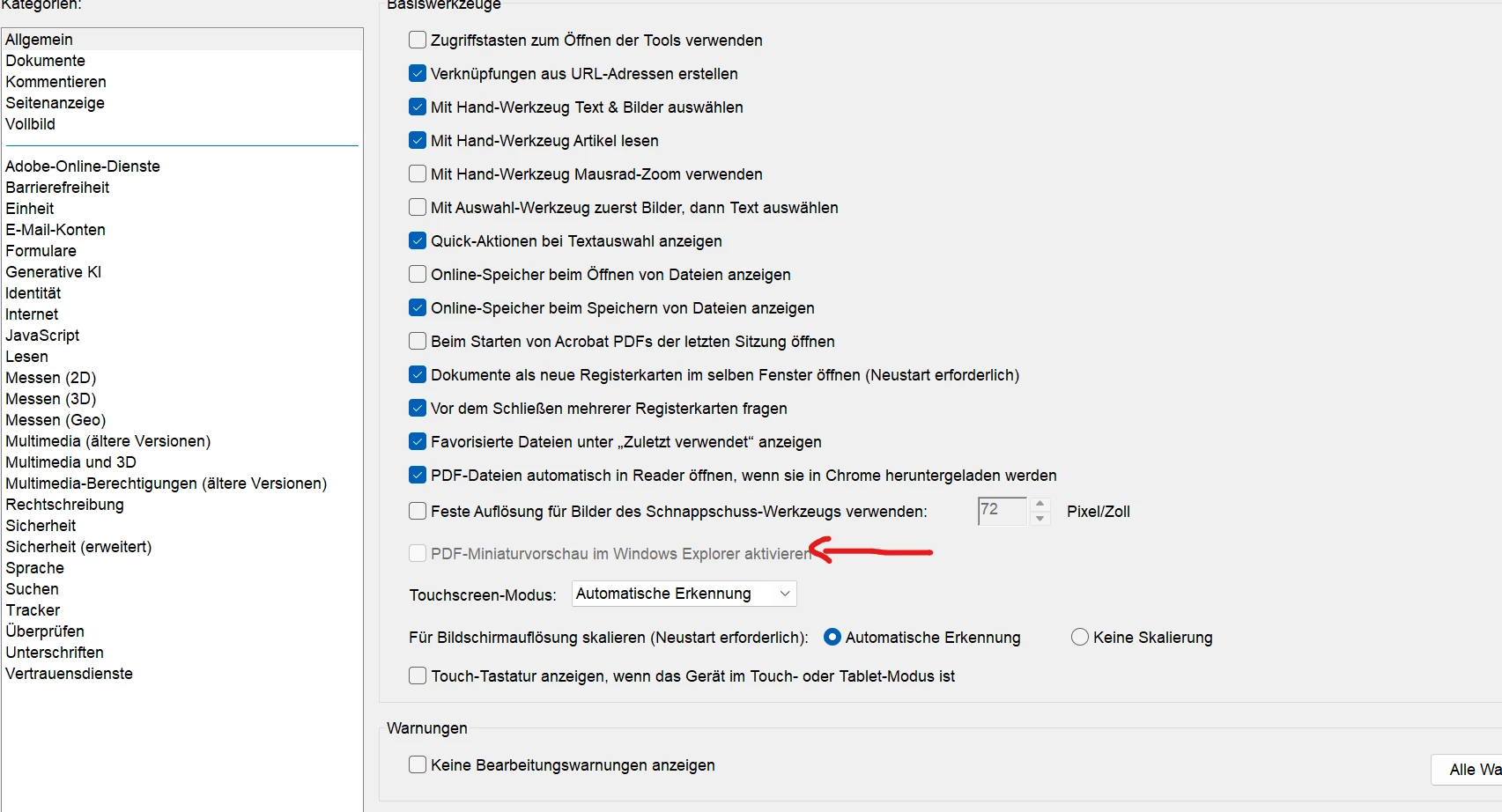 I have a new laptop and, strangely enough, after downloading Adobe Acrobat Reader I cannot activate the above-mentioned preview window in the Adobe Acrobat Reader settings. I have already uninstalled and reactivated the program several times and also checked for updates. The latest version 25.001.20432 is installed.