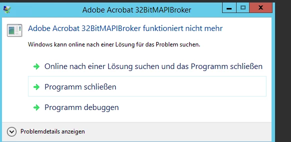ich habe das Problem, dass auf meinem Terminal-Server die Folgende Meldung kommt: Adobe Acrobat 32BitMAPIBroker funktioniert nicht mehr.