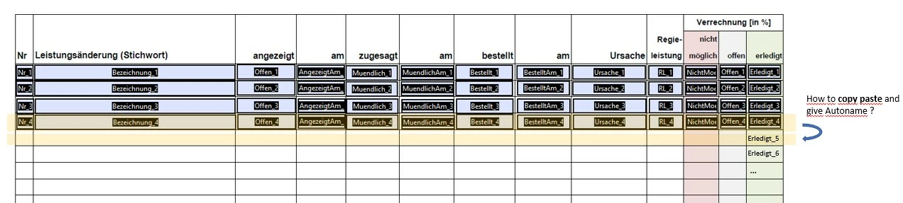 I want to copy a row and give the fields an automatic name when I paste them. If I just copy paste it, the name stays the same. Is it possible to use a script or something similar to automate it?