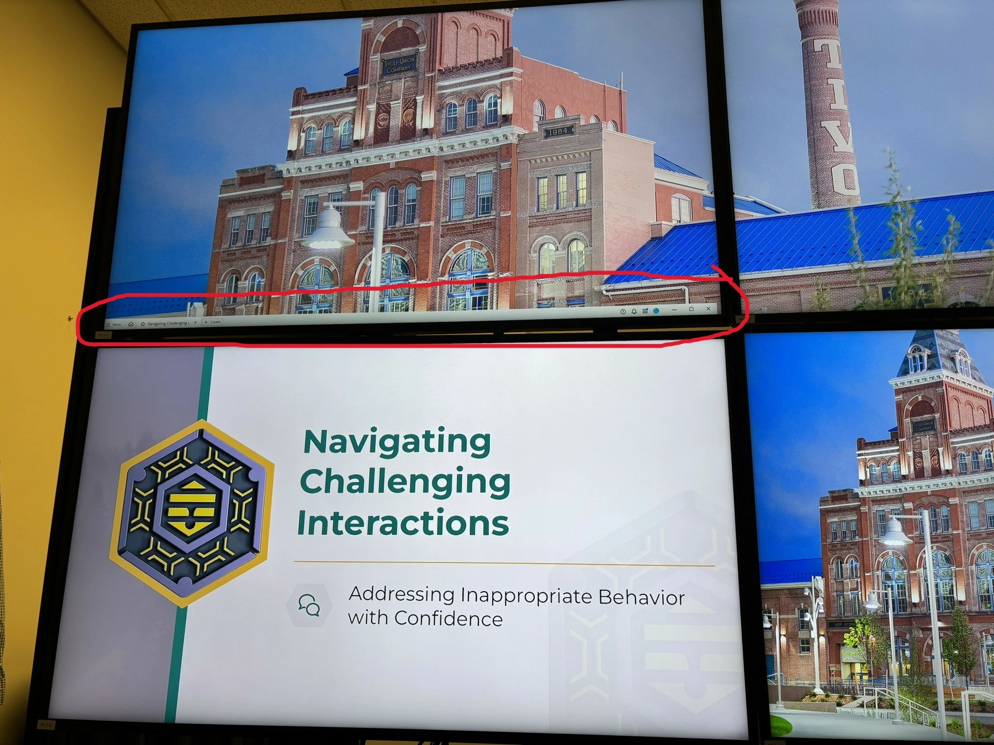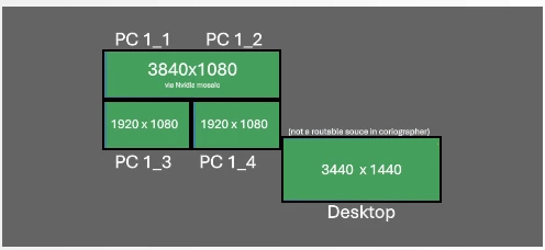 This picture show my monitor topology to provide some further understanding and conceptualization. I display widescreen graphics in my event space and the menu bar with overlay on top of those graphics.
