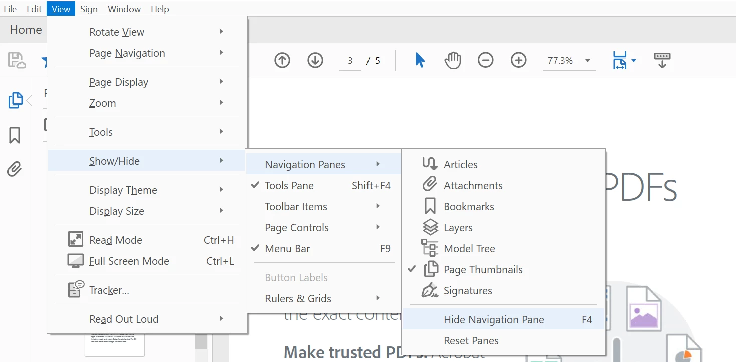 Adobe Acrobat Reader 2020 - deactivating the navigation panel