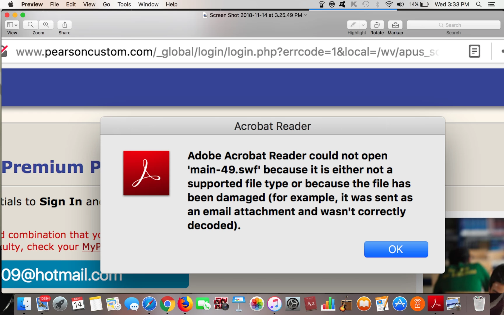 I am trying to log into one of my accounts on the internet browser firefox and when I click sign in "Adobe Acrobat Reader could not open 'main-52.swf' because it is either not a supported file type or because the file has been damaged (for example, it was sent as an email attachment and wasn't correctly decoded)." pops up and I can not continue.