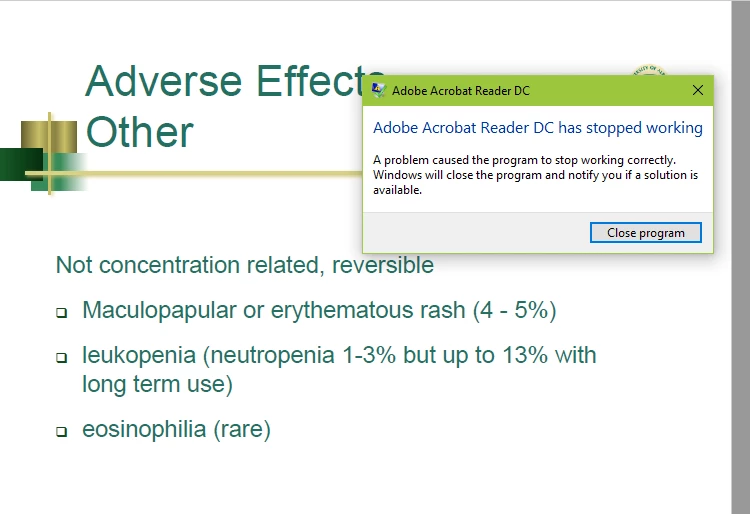 I have been using adobe for a number of years and since September this year (not sure if it correlates with an update) I will periodically get the error depicted in the image below. This is very frustrating to me as I use adobe to take notes in class and sometimes this results in lost notes and rage (lol). Some days adobe works fine and I do not get any errors causing the forced shutdown. Other days I will get error after error and basically be unable to use the program. Currently I seem to be getting allot of errors while using dual monitors. For example, I have adobe running on both screens at once (error rate about once every 30 mins).