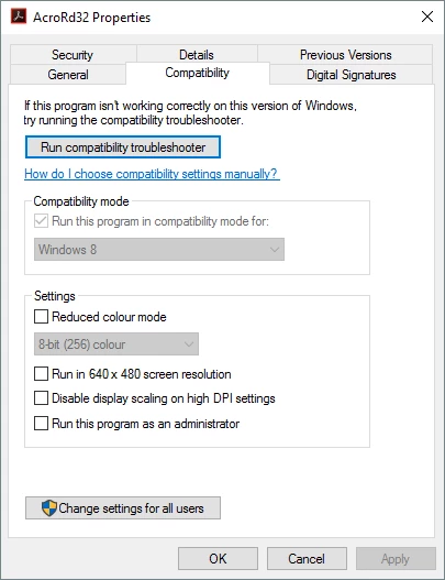 Thanks Robert.  I thought I would try this yesterday but I do not have the option to change compatibility(even running the program as an administrator does not allow me to change the compatibility.  It is fixed on Windows 8 even though my OS is Windows 10.  I even un-installed and re-installed in different OS versions multiple times but it still reverts me back to Windows 8.  See image.