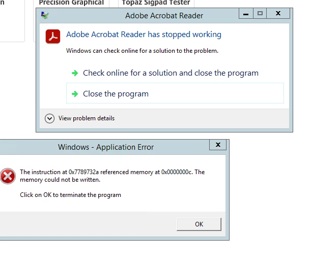 We have multiple people receiving this error message when opening pdf's. The windows error seems to be pointing to a NTDLL.DLL. Does anyone have some tips?