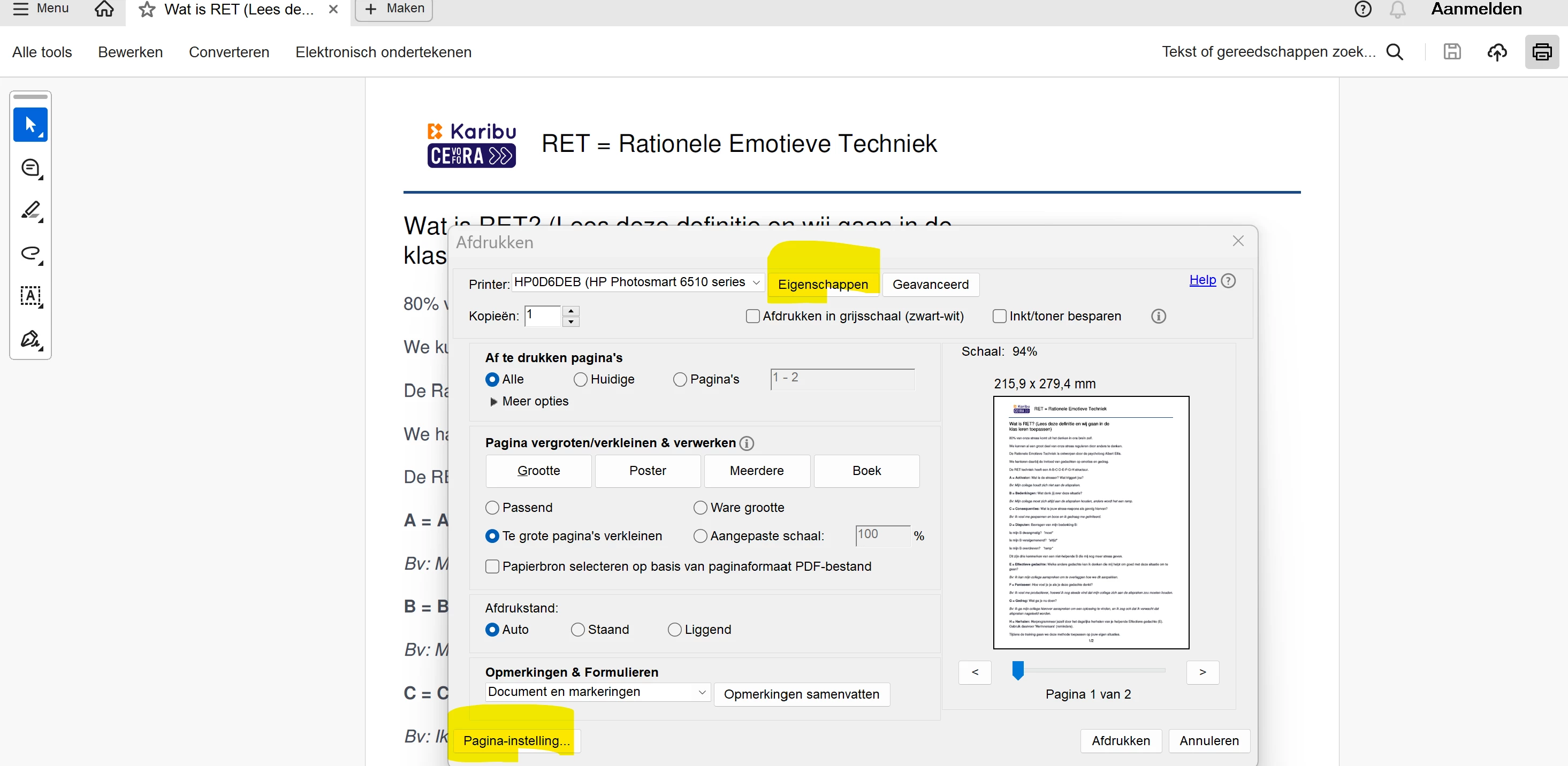 On the screen shot I highlighted these two buttons : properties (in Dutch eigenschappen) and page settings (in Dutch pagina instellingen). However, I can open the advanced window.