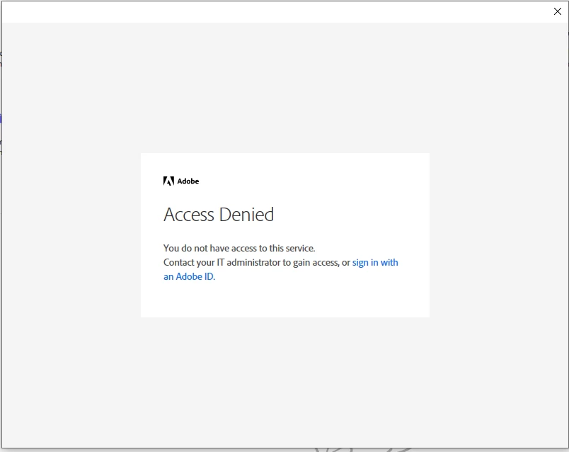I am a graduate student and tried to install the Creative Cloud using my academic login as suggested by my University. Unfortunately, as I am an online graduate student, I was subsequently told that I probably would not be able to access the Creative Cloud because I was not using the University's servers. I uninstalled the Creative Cloud program and used the Adobe Acrobat Cleaner tool to remove the Adobe Acrobat Reader DC version that was unsuccessfully associated with my University account. Unfortunately, when I reinstalled Adobe Acrobat DC and tried to log in with my personal account, I received an "Access Denied" error, as displayed in the attached screenshot. This error persists even when I click on the "sign in with an Adobe ID" and input my persona;l account credentials. I need guidance on correcting this error to allow me to log in to Adobe Acrobat Reader DC with my personal account. Any assistance would be appreciated!