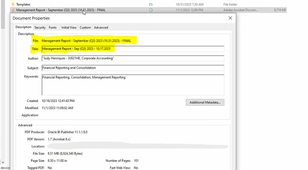 User can see the file on the shared drive synced and says that the last time the file was updated was on November 1 (last time the manager made a changed) but once the user opens the file, opens a different file called Management Report - Sep (Q3) 2023 10.17.2023 with the information not updated