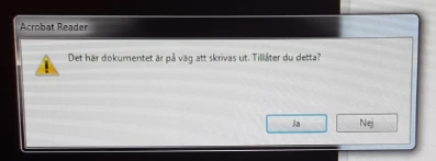 I'm trying to help a customer with this problem. They use a site via Google Chrome to print invoices/receipts and everytime they click on the Print-button the PDF downloads and opens in Acrobat Reader. Then the below attached prompt apperas, roughly translated to "This document is about to be printed. Do you allow this?". Even if I press "Yes" it doesn't print and you have to go back to the site and press "Print" again to download the same PDF again which then opens in Adobe Reader and brings up the ususal print prompt, where we can press "Print" to get it to print.