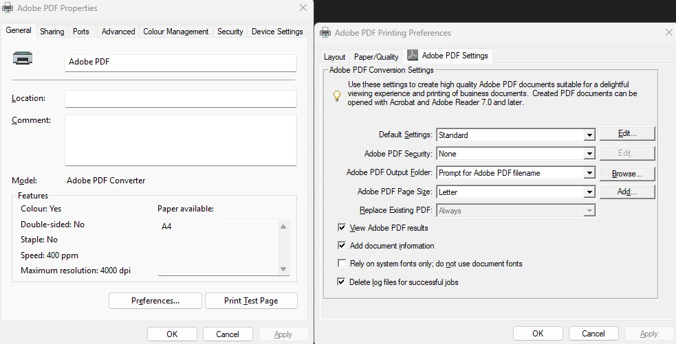 I use Adobe Printer as my default PDF printer, but as soon as I print a document the Adobe Printer’s default paper size settings revert back to “letter” in stead of staying on A4 after it was saved.