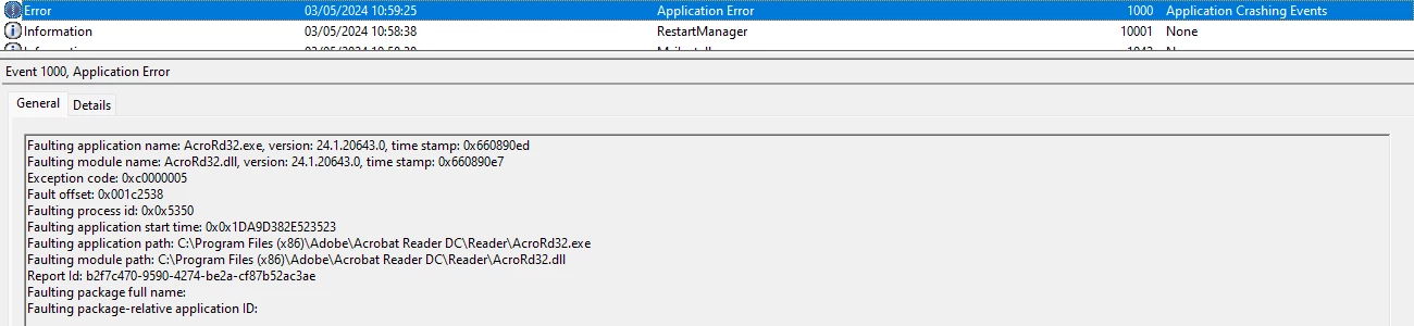 Faulting application name: AcroRd32.exe, version: 24.1.20643.0, time stamp: 0x660890ed