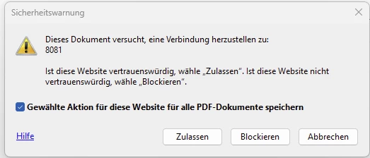 When opening a document from a WebDAV location (e.g. \\server@8081\XXXX) then Adobe warns me about opening this document because the host is not in the trusted list. The host should be "server", but Adobe interprets the non-standardized port (8081) from the file path "server@8081" as host.