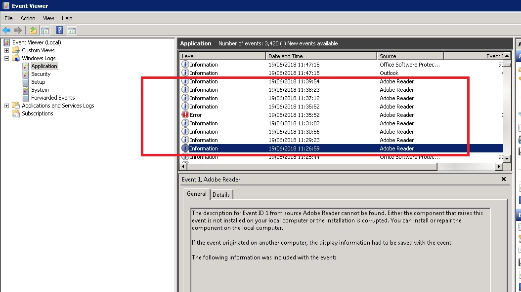 The description for Event ID 1 from source Adobe Reader cannot be found. Either the component that raises this event is not installed on your local computer or the installation is corrupted. You can install or repair the component on the local computer.