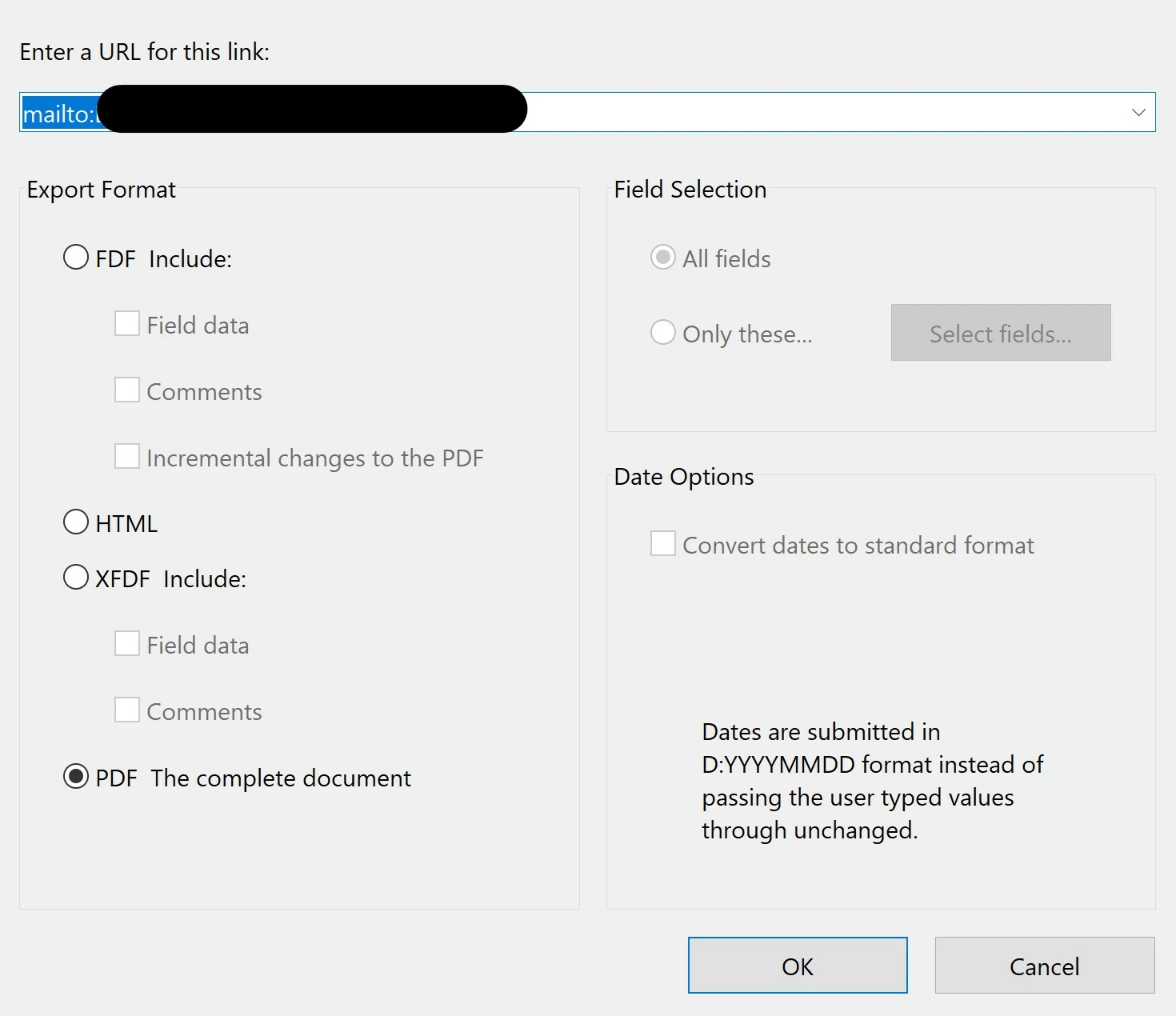 I have Adobe Acrobat Pro DC installed on my computer. I am trying to create a fillable PDF form that has a submit button on it. My goal is to publish this to my school website so people can send it to my email at the ease of a button. I believe I have followed all the necessary procedures. 1. Made a button on the form. 2. Set the action button to submit the form like this: mailto:"email".