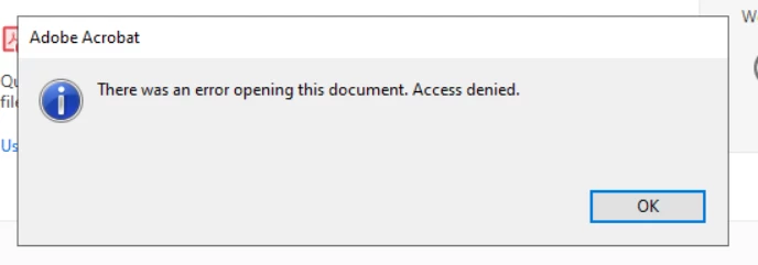 Has anyone seen an issue with the latest build of Adobe Reader DC and Citrix ShareFile mapped drives? I had a client report this issue today, and was able to reproduce in my lab. Have tested with various versions of Citrix Files including the latest (20.11.19), and Adobe Reader version 2021.001.20135. Opening a PDF file produces the error "There was an error opening this document. Access is denied." (see screenshot).