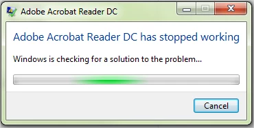Adobe Acrobat Reader DC has stopped working. Windows is checking for a solution to the problem and then it says A problem caused the program to stop working correctly. Windows will close the program and notify you if a solution is available.