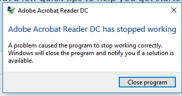 Adobe Acrobat Reader DC has stopped working. Windows is checking for a solution to the problem and then it says A problem caused the program to stop working correctly. Windows will close the program and notify you if a solution is available.