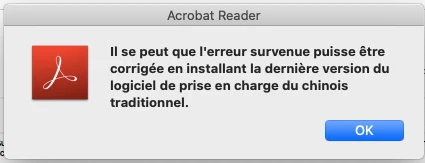 Depuis un moment, je ne peux plus insérer une zone de texte sur un document dans Adobe Reader. J'ai un message d'erreur qui s'affiche: "Il est possible que l'erreur puisse être corrigée en installant la dernière version du logiciel de prise en charge du chinois traditionnel".