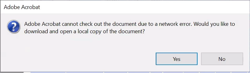 The user is unable to open/access a PDF file. The file is getting saved while in online mode. The error is happening with few documents only in the adobe acrobat reader. Here is a snapshot of what message the user gets.