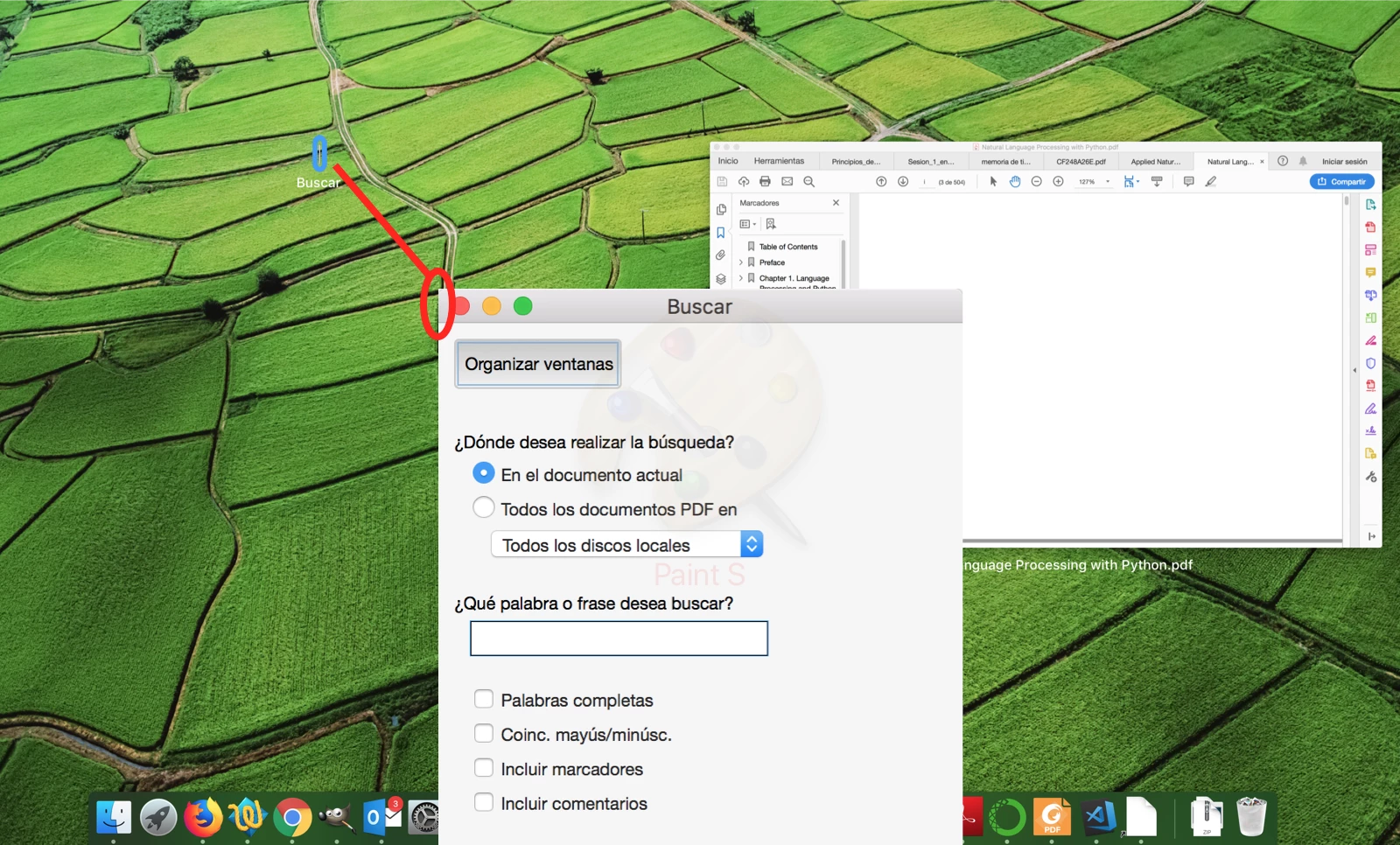 When I try to open de "advance search" window, which I use a lot in my personal Windows system and works perfectly, in my work's MAC system the tool doesn't open, and if i use the trackpad to see all the application's windows, I see a small line (screenshot attached below) that seems to be the search window but I cannot do anything, and when clicking over it, i get the main Acrobat window.