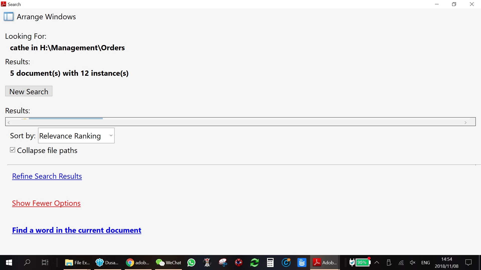 When Adobe Reader XI, version 11.0.23 (and couple of previous versions) performs advanced search, results are actually not visible - results field is less than a line high, while there is plenty of empty space in the rest of the page. Screen shot attached. Any idea how to resolve the issue - be able to see results, scroll and select...?