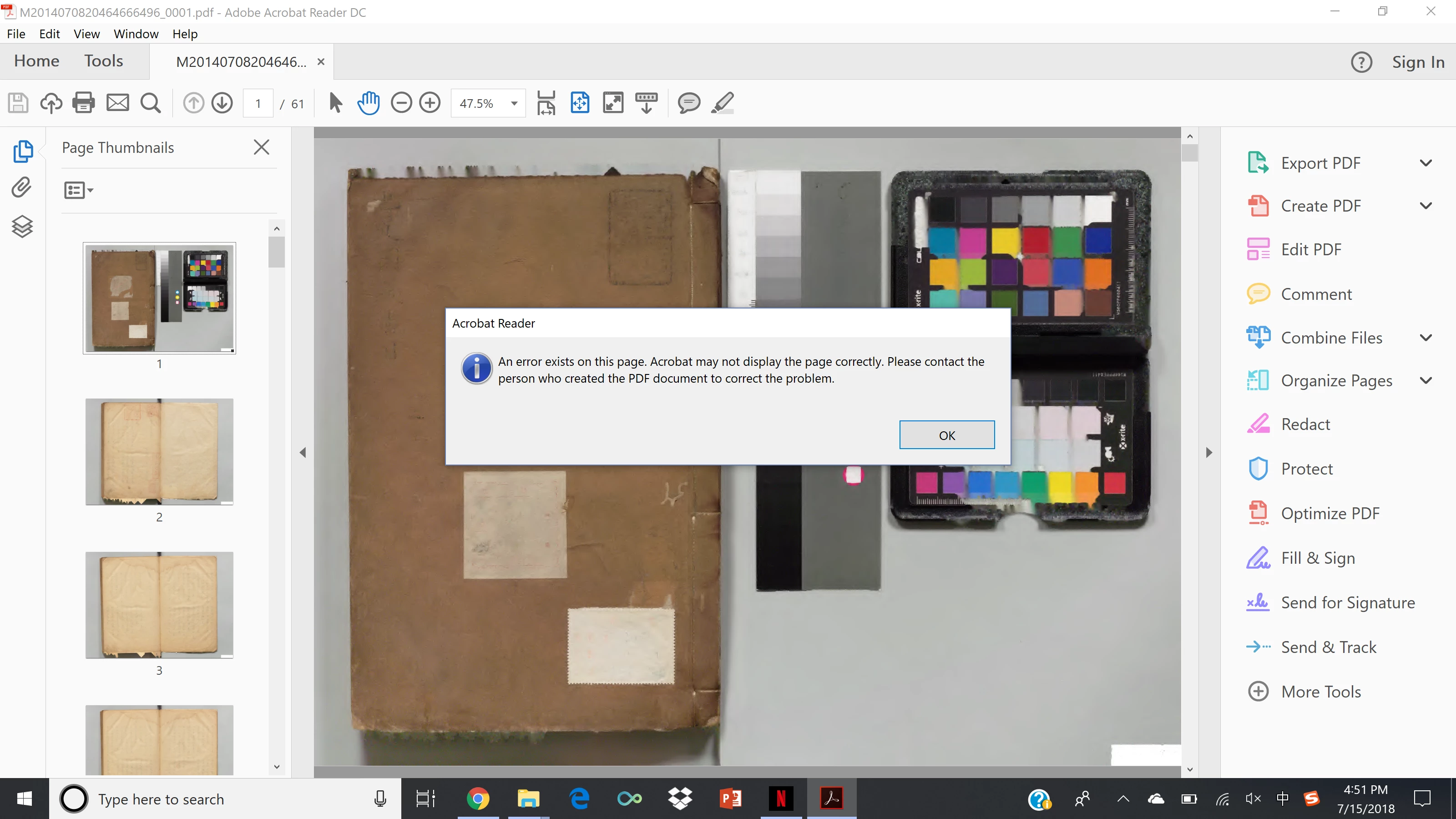 I downloaded some large high res PDF image files of ancient documents to my computer. I was able to view them with no problem until all of a sudden they stopped opening properly and an error message now appears whenever I attempt to open one. It reads: "An error exists on this page. Acrobat may not display the page correctly. Please contact the person who created the PDF document to correct the problem." Obviously this has nothing to do with the creator of the PDF. Other PDF text and image files work fine. I attempted to repair the installation, I uninstalled and reinstalled Acrobat, nothing has worked. Please assist. Thank you.