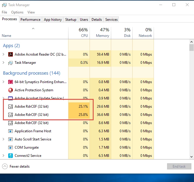 I've also had no success after re-installing the Microsoft Visual C++ several times. Plus I uninstalled and reinstalled Adobe Reader DC several times. I've noted the error for some time but did not research it until I traced poor performance on my PC to Adobe. I opened task manager and noted Adobe was sucking up all my CPU. This is a shot with just one document open. With 3 open my CPU was at 99%.