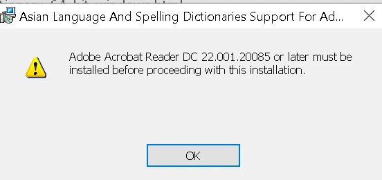 I tried to install the Font and Spelling dictionary pack from here https://helpx.adobe.com/acrobat/kb/font-pack-spelling-dictionary-64-bit-windows.html