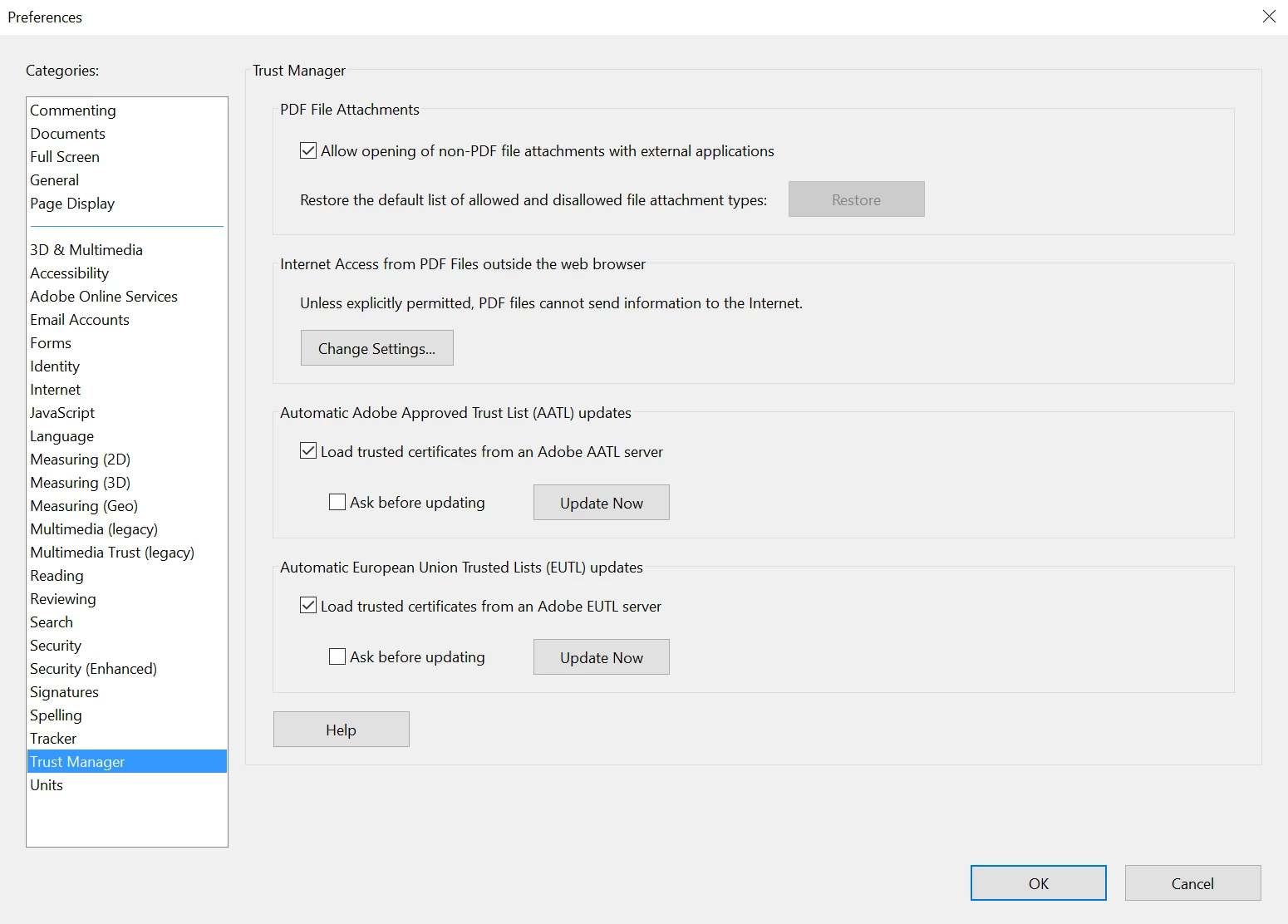 - Adobe Reader Preferences must be up to date. Adobe Reader is sometimes set up with more stringent security settings , which could result in Global Sign CA not being on the list of trusted certificates. To make sure Trusted Certificates are up to date in Adobe Reader, use the Main Menu navigate to EDIT/PREFERENCES/TRUST MANAGER and check the boxes Load trusted certificates from Adobe AATL server and Load trusted certificates from an Adobe EUTL server. Click Update Now for both certificate types. Click OK to exit.
