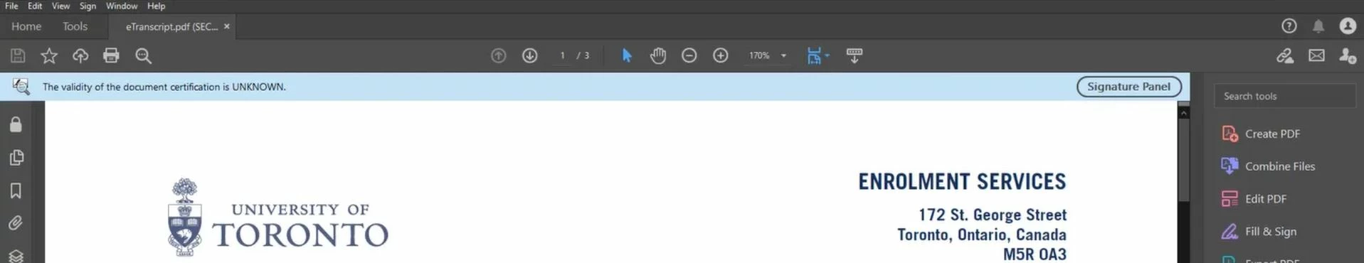 There is no problem with the document, because when I try to verify the digital sign on the document before, it succeed. However, I don't know why this time when I try to verify the document, it indicates that the validity of the ocument is “UNKNOWN”. I have already tried the following troubleshooting tips listed on my school's website, but still does not work. Could anyone help me? I am very urgent to verify my degree dipolma. Thank you so much!!!