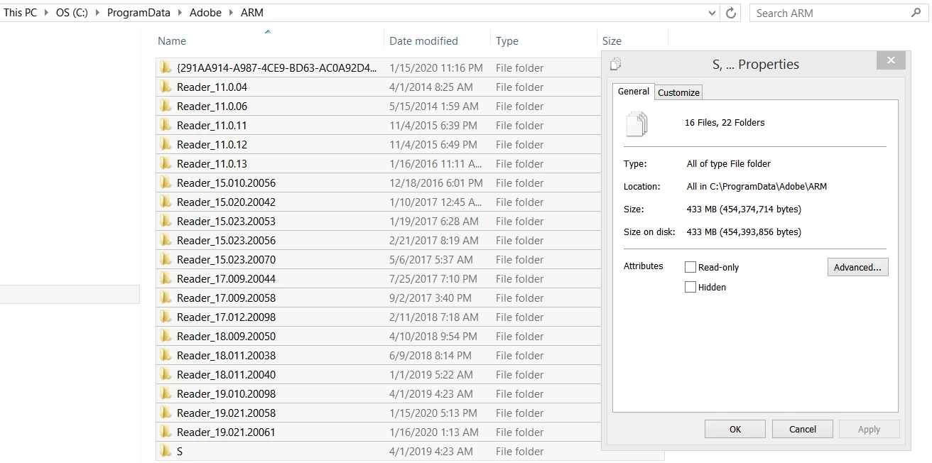 There are 2.8 GB of ARM files on my computer. They are located in C:/ProgramData/Adobe/ARM/ and are in folders from previous versions (Reader_10.0.1, Reader_10.1.4, Reader_10.1.5, Reader_10.1.6, and Reader_10.1.7,). I need the space (it's a 40GB drive with less than 2GB free space). Can any or all of these files/folders be deleted?