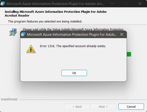 But the Adobe MIP plugin (https://helpx.adobe.com/acrobat/kb/mip-plugin-download.html) I can't get to install. Neither regularely as user with admin permissions, or silently with /i "<filename>.msi" /qn /norestart. Installer fails with 1316 something about "account already exist".