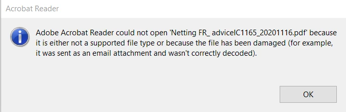 Hi, i got the attached error message when I tried opening up one of my pdf files. Pls help.