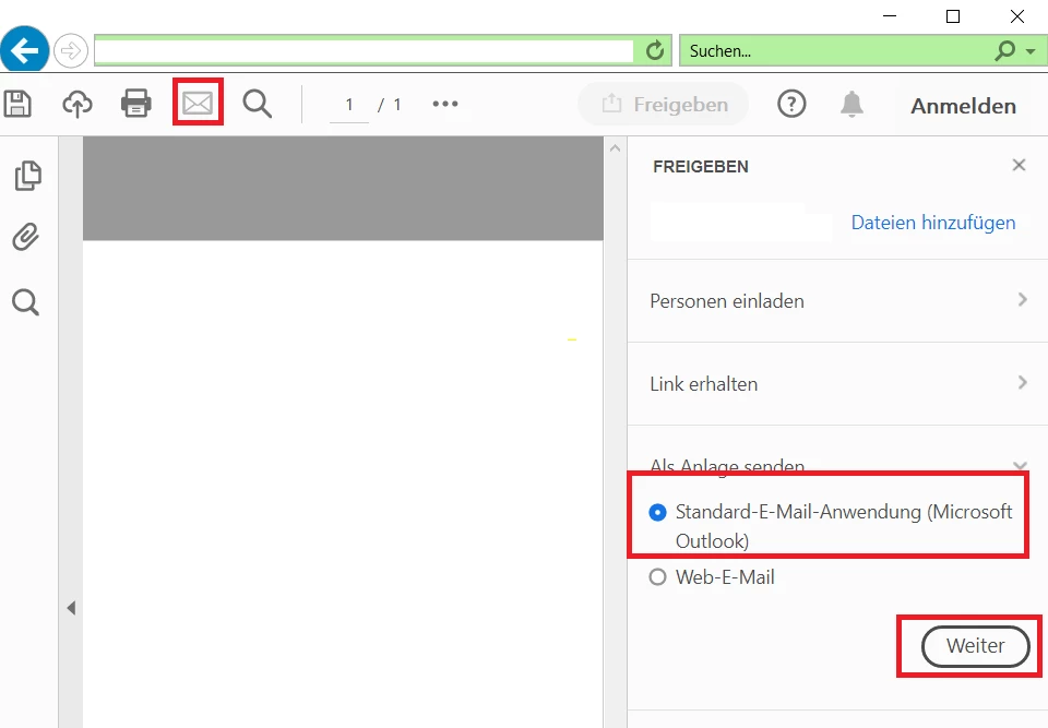 If we disable the Adobe Reader Addon for Internet Explorer the PDF file opens in Adobe Reader and that is working fine (send as attachment works). But not in Internet Explorer with Adobe Reader Plugin.