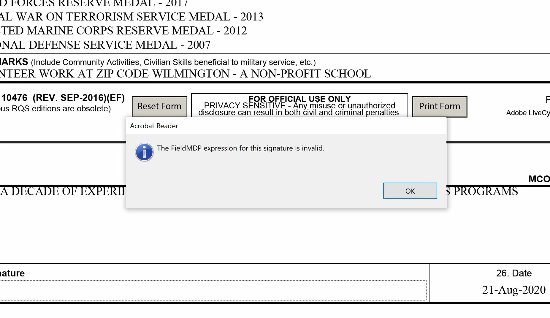 I am trying to sign a form and getting the above error. My team has roughly 20 members that each need to sign a copy of this form, and everyone is getting the same error. Is there a workaround or a plug-in that we need to download? Can we use a regular signature instead of a CAC (military Smart Card ID) signature?