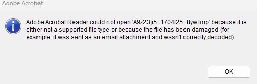I have been able to convert files from Pdf to Word, but today it was impossible. It says: " Adobe Acrobate Reader could not open A9z23ji5_1704f25_8yw.tmp because it is either not a supported file type or because the file has been damaged (for example, it was sent as an email attachment and wasn’t correctly decoded)."