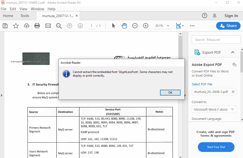 Cannot extract the embedded font 'GlyohLessfont'. using Acrobat Reader DC Version 2020.009.20074