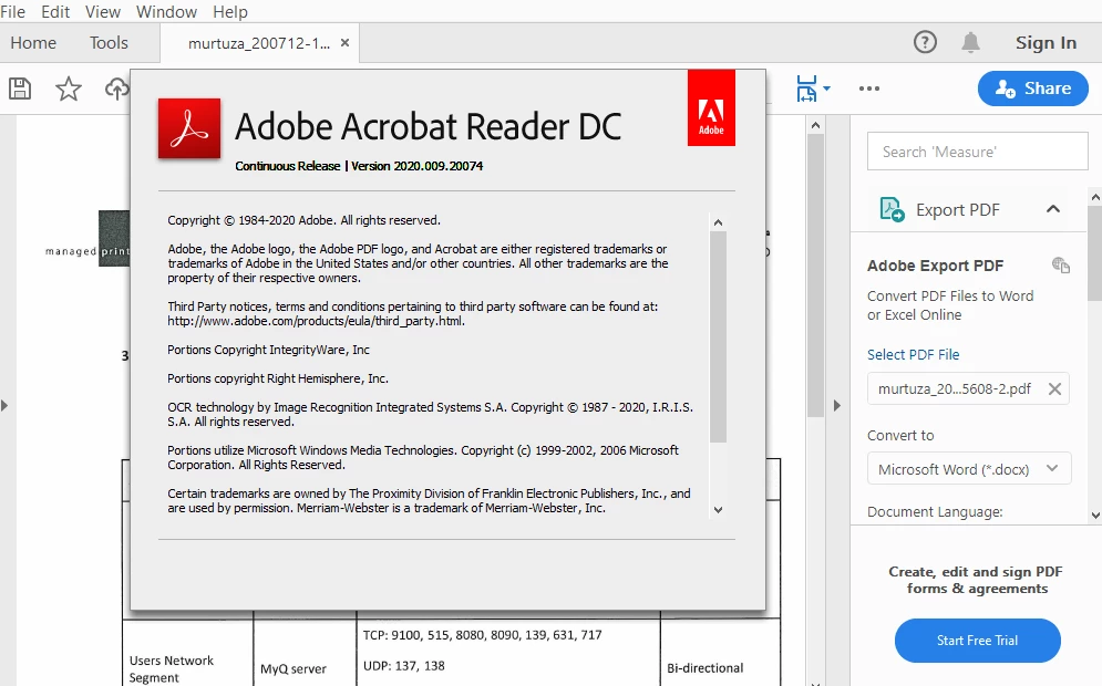 i am facing the issue on the PDF file which is created by scanning and done OCR while opening the file I get 'Cannot extract the embedded font 'GlyohLessfont'' message. I am using Acrobat Reader DC Version 2020.009.20074, I also tried to re-install but the issue is the same. the same PDF file is opening without any issue in Foxit PDF reader. even I tried to do the same with other scan document issue is same. below are the screenshots of the message, properties(fonts tab), and version of Acrobat.