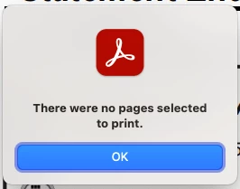 I am trying to print a 4 page pdf from Acrobat Reader DC v 2021.007.20099. If I select the default to print all pages, these are my error messages:
