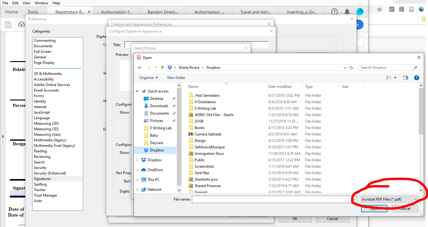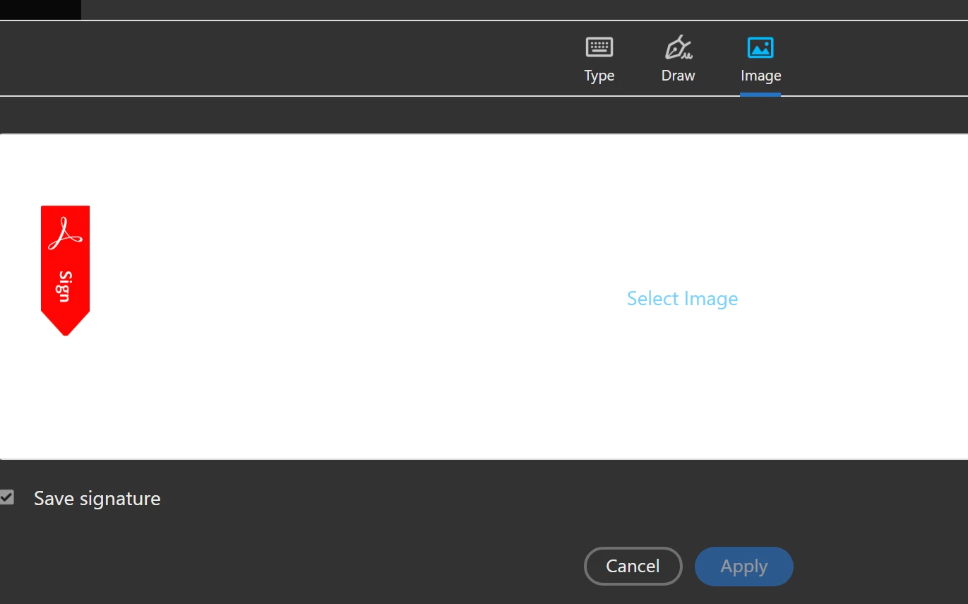 I'm trying to add a signature to my Adobe account in Adobe Reader DC. I have a PNG of my signature, but when I try to upload it, I can't because uploads are limited to PDF file types (?). There are no other options in the drop-down. This happens whether I go through Preferences or try to sign a document directly. Any guidance on how to upload the PNG of my signature?
