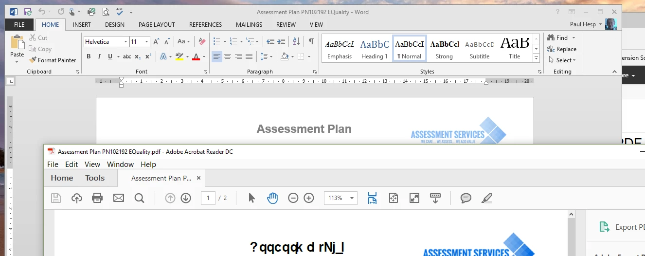 Text sometimes appears as gobbledegook, seems to be only in headers- an example of one I just saved is in attachement- a screenshot showing the original Word doc in background, and PDF created in foreground. The gobbledegook can be seen top centre.