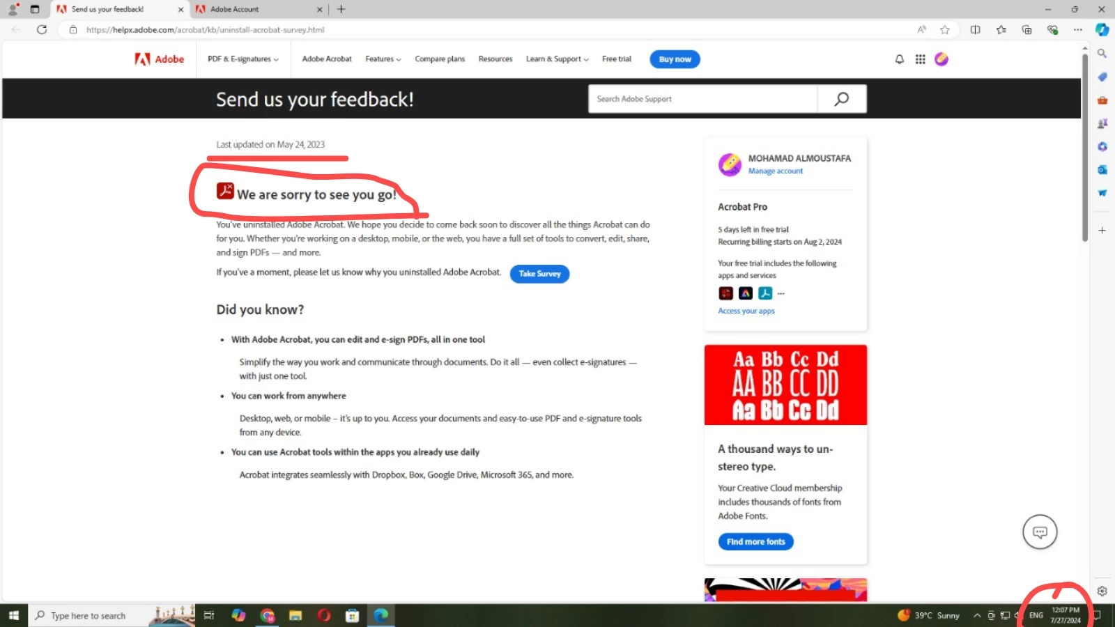 I am writing to bring to your attention an issue I encountered with my recent subscription to the Adobe Reader program. On July 26, 2024, I subscribed to the free trial of the latest edition of Adobe Reader on my PC. However, I uninstalled the program within two days, well before the free trial period ended.