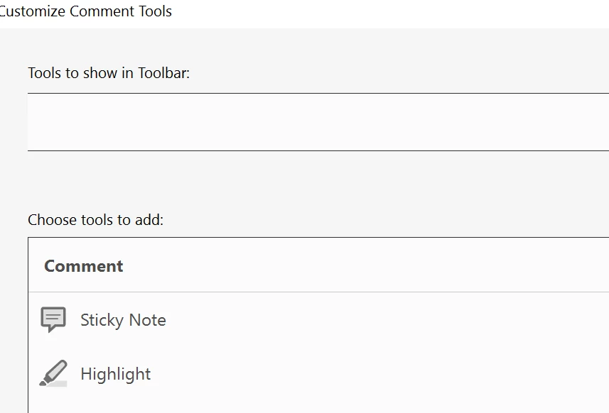 • If yes, then you may see whether there is any specific list of comment tool is added or its blank? By default all the commenting tools should be available in the toolbar. So, there shouldn't be any customization here.