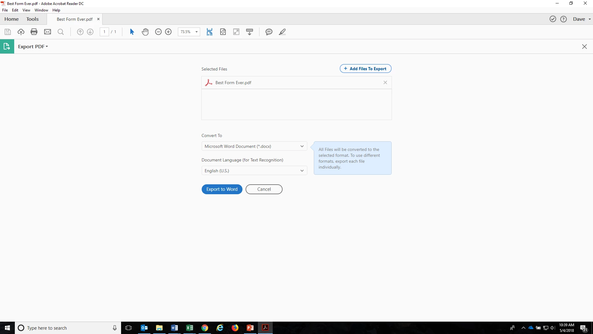 Can you confirm how you have been trying the conversion? Was it online via https://cloud.acrobat.com/exportpdf  or through the desktop application Adobe Reader?