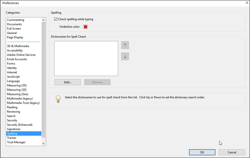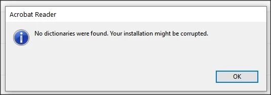 Dictionary missing in Adobe Acrobat reader DC on Windows