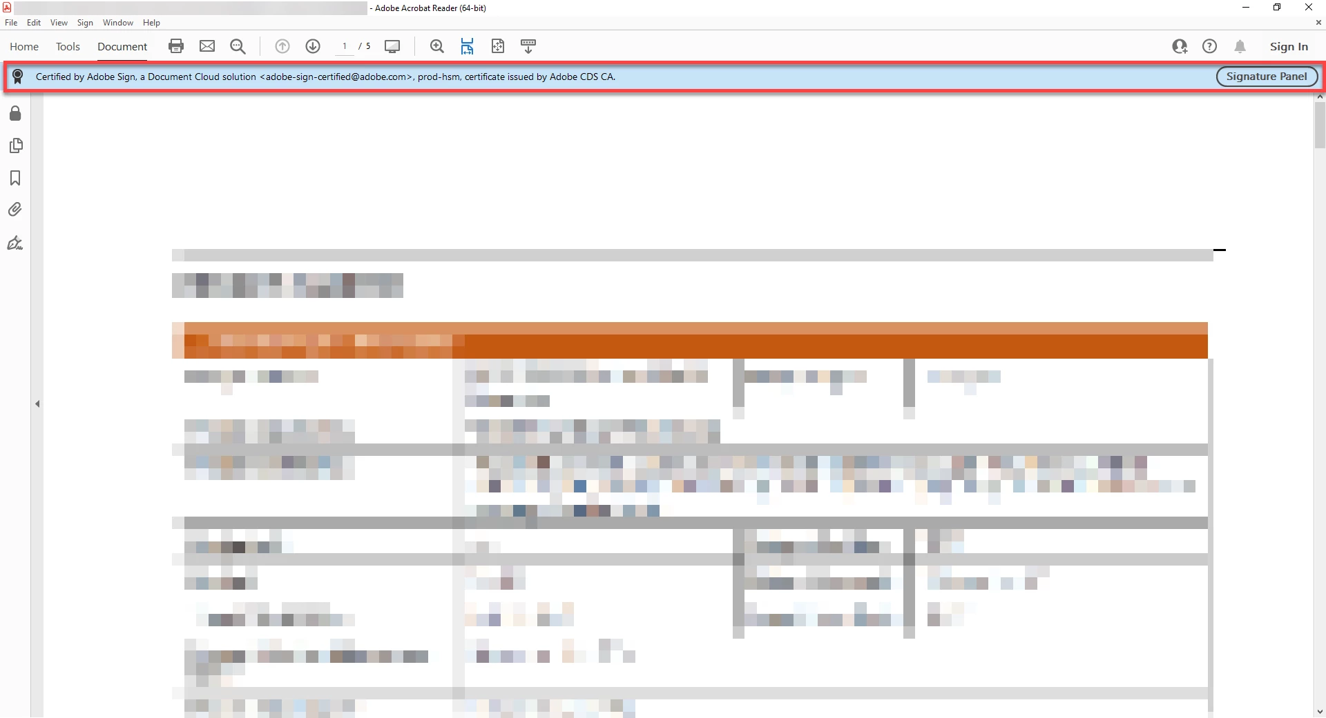 The blue bar you see at the top (“Certified by Adobe Sign …”) is part of Acrobat/Reader’s signature validation information. It appears automatically whenever a PDF has a digital signature or certification applied. Currently, there is no option to permanently disable or hide the Signature Panel bar for signed/certified PDFs. This is by design, since the app must show the document’s trust and authenticity status. For more details, please see this Adobe article: Validating digital signatures.